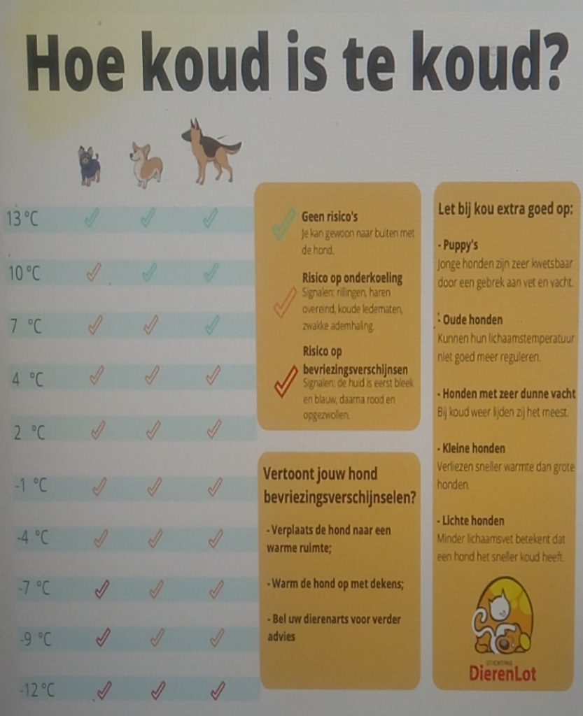 Onderkoeling/Bevriezing: Belangrijke signalen -> Let bij kou op de volgende signalen om te zien of je hond het koud heeft: problemen met ademhalen, hond is in zichzelf gekeerd en maakt geen contact met jou, zwakke hartslag en rillen. Wordt de huid van de hond bleek en blauw en in een later stadium rood en opgezwollen? Dat kan betekenen dat je hond last heeft van bevriezing. Ook kan je hond dan pijn krijgen aan de oren, staart of poten. Neem altijd contact op met je dierenarts! Tips: Doe warm (niet te heet) warm in zijn/haar drinkbak; stop je hond lekker warm in met dekens en warmtekruiken.
